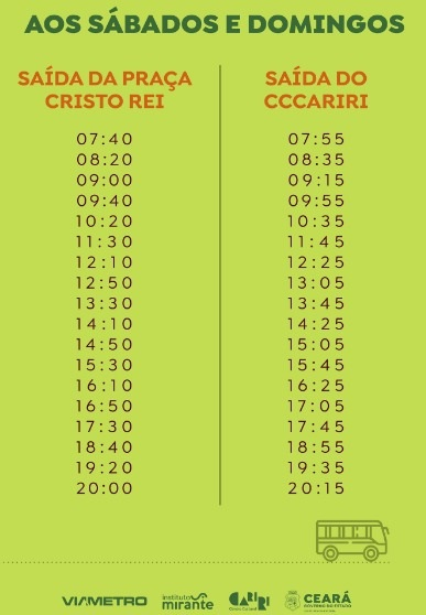 A iniciativa aumenta o raio de alcance de populações de cidades do Cariri, proporcionando mais opções de lazer e cultura. O local escolhido de forma estratégica como ponto de partida foi a Praça Cristo Rei, pois é o lugar de convergência das rotas que atendem as cidades de Juazeiro do Norte e Barbalha, assim como de outros bairros da cidade do Crato e também de distritos da zona rural. VEJA OS HORÁRIOS: